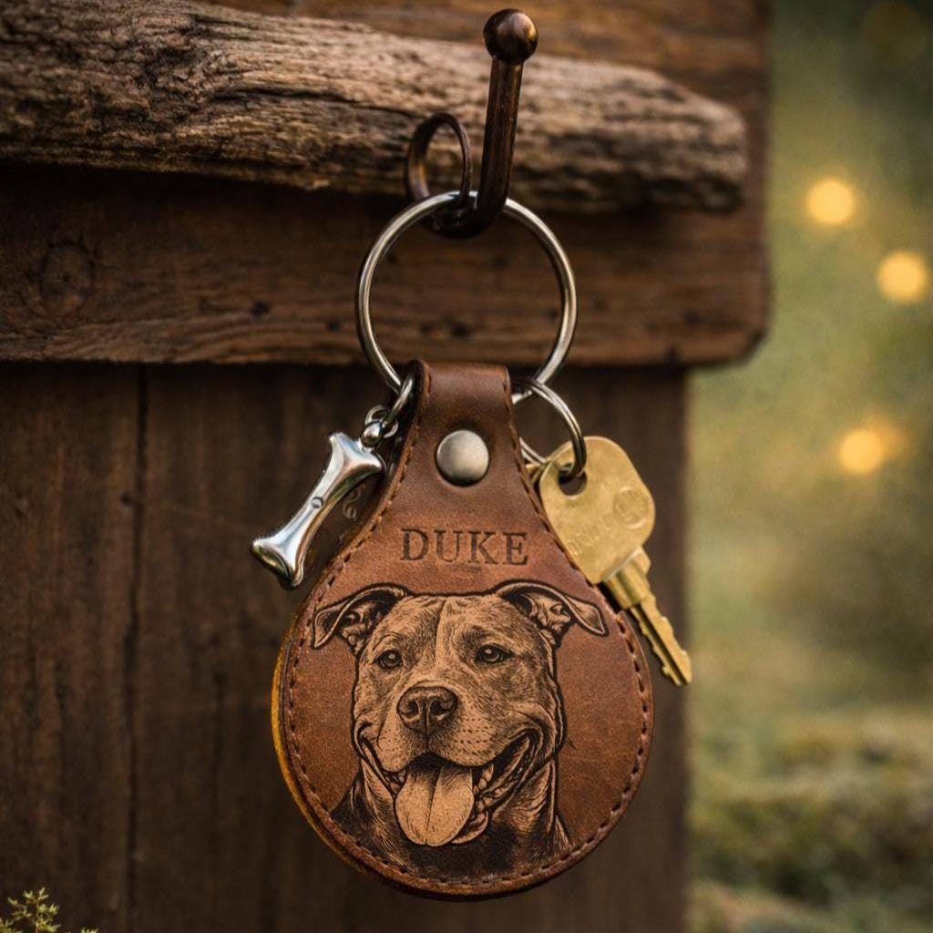 This personalized dog memorial keychain is a custom pet loss keepsake made from leather with a tiny ashes vial — a heartfelt remembrance gift for honoring the memory of a beloved friend. A quiet way to keep your pitty close—right on your keys.