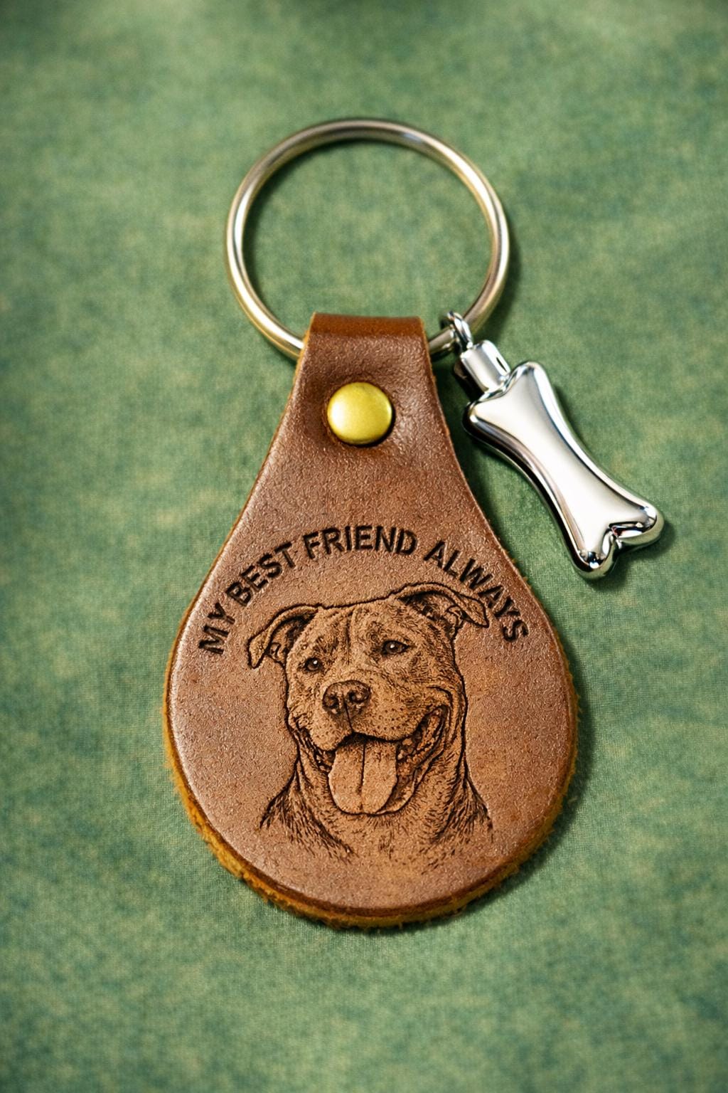 This brown leather (cowhide) teardrop keychain is laser-engraved with a pitbull stock image and, if you wish, your dog’s name or remembrance. A tiny stainless-steel vial holds a small portion of ashes for a personal, private remembrance. Vial is water resistant only, please keep dry.